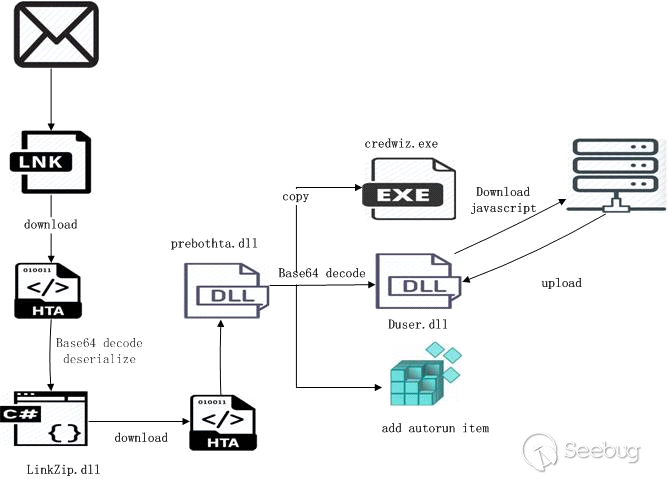 "SideWinder(響尾蛇)"APT組織在初始化攻擊時時,會向目標發送一個釣魚郵件。郵件中包含一個可以下載ZIP文件的鏈接。下載下來的ZIP文件通常包含一個LNK文件或者DOC文檔。點擊這些文件后會下載一個HTA文件,HTA文件會在特定目錄釋放一個Duser.dll文件。接著將系統文件credwiz.exe拷貝到該目錄,為credwiz.exe添加一個自啟動項。然后運行credwiz.exe,credwiz.exe會加載Duser.dll。Duser.dll通常是不包含惡意代碼,它會進一步的加載執行其他惡意代碼。目前我們觀察到"SideWinder(響尾蛇)"APT組織使用的攻擊方法大致分為三種: