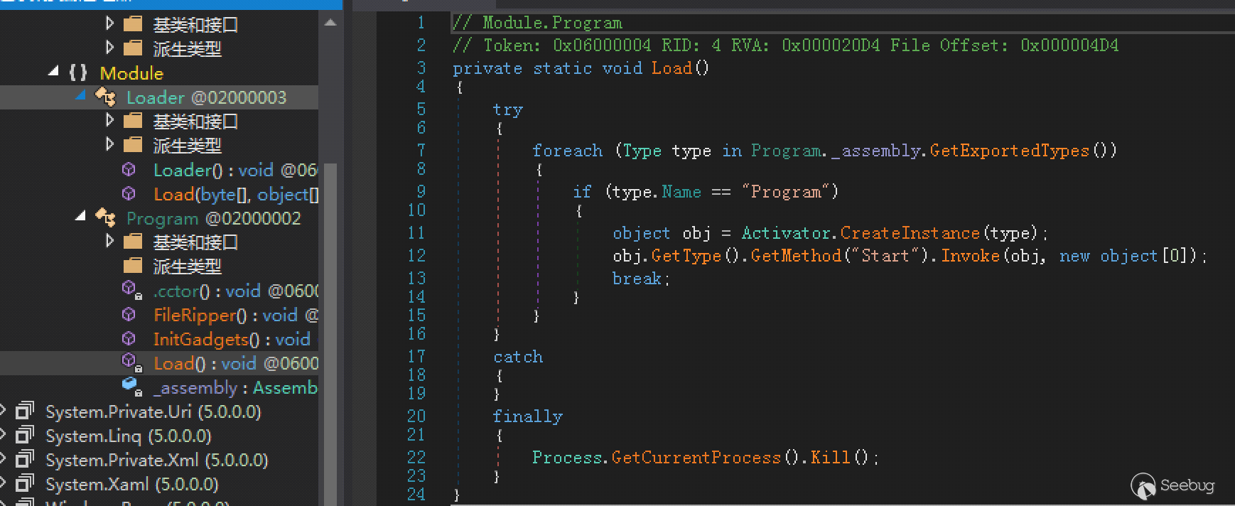 var ec = 'preBotHta' 聲明了要調用的的類。so字符串解碼后是一個經過序列化的DOTNET模塊,它的內部定義了一個preBotHta類。調用過程如下: