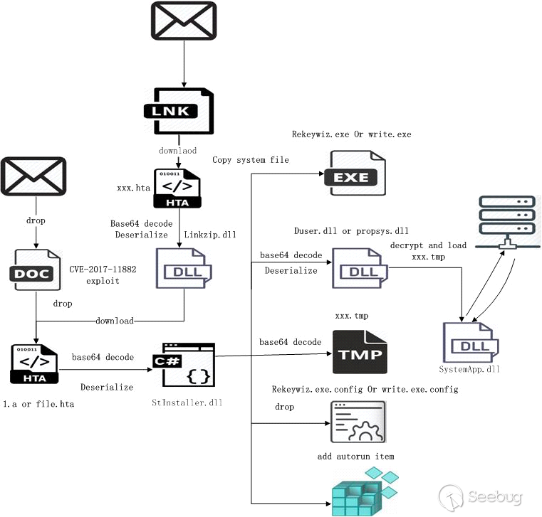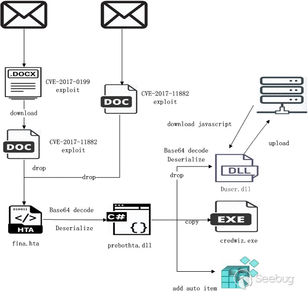 這種類型通常是通過郵件投遞一個包含漏洞利用的文檔。有的文檔是DOCX文件,它利用CVE-2017-0199漏洞(其實是模版注入)下載一個RTF文件,RTF文件包含一個CVE-2017-11882的利用,漏洞觸發后釋放一個名字為fina.hta文件。有的是一個僅僅利用了CVE-2017-11882漏洞的RTF文件。