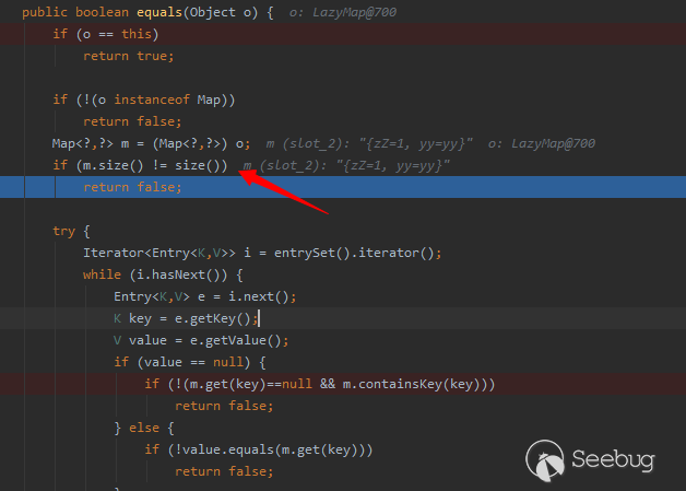 調用remove清空lazyMap2中的yy元素,是為了保持兩個LazyMap對象中的元素個數保持相同,由于在AbstractMap#equals方法中存在LazyMap元素個數比較的判斷條件