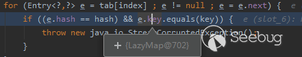 在reconstitutionPut方法中會調用e.key.equals(key)方法。依靠之前的CommonsCollections利用鏈的經驗,需要在入口類通過各種方法的調用,從而調用到LazyMap#get方法,CommonsCollections7的gadget構造思路也如此,Gadget作者通過調用equals方法,串聯入口類和LazyMap。由于在序列化對象構造時,將LazyMap對象作為Hashtable的key值傳入到Hashtable的元素中。因此在調用e.key.equals(key)方法時,實質是調用LazyMap#equals方法。