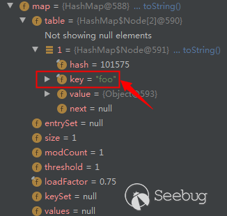 并且為了保證e.key.equals(key)方法中 e.key是LazyMap對象,且傳入的key參數也需要是LazyMap對象,因此需要實例化兩次LazyMap對象,在Hashtable中進行key比較時,完成LazyMap的調用,從而完成利用鏈的構造。