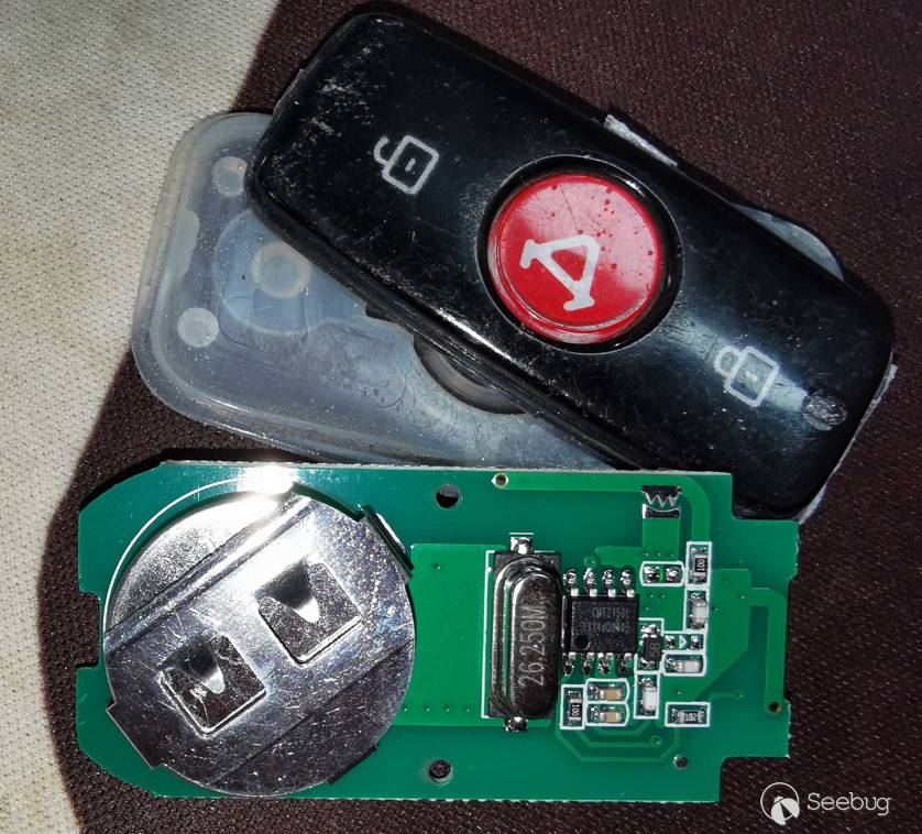 因為是在實驗室環境中, 所以筆者選擇直接將其拆開一探究竟。 在小牛鑰匙的PCB板上清楚看到晶振 (26.250M)和IC (CMT2150L) 這兩個關鍵部件。