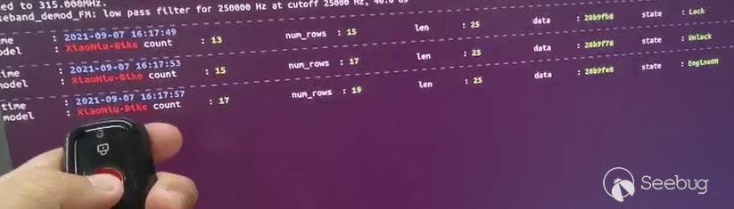 在把相關參數編寫成配置文件后, RTL_433就可以自動解析了。從視頻(https://v.qq.com/x/page/y3275usojth.html) 里可以清楚看到小牛鑰匙每次所發出的解鎖或上鎖等指令。