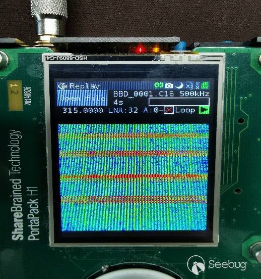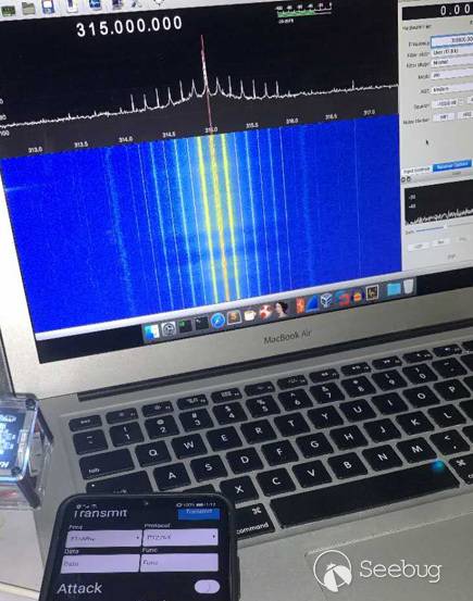 然而現實中往往受條件限制, 無法獲取更多有用信息。 這就要考驗測試人員的實戰經驗和耐心了。 幸運的是除了汽車無線鑰匙外, 工作在315Mhz 或433Mhz, 且以固定碼模式為主的遙控設備在現實中仍占了很大的比例。 所以我們可以把相關設備如HackRF放在合適的位置進行抓包, 耐心等待遙控開鎖指令被按下的那一刻。 一旦獲取所需的解鎖指令, 就可以通過信號重放的方式得到控制權。