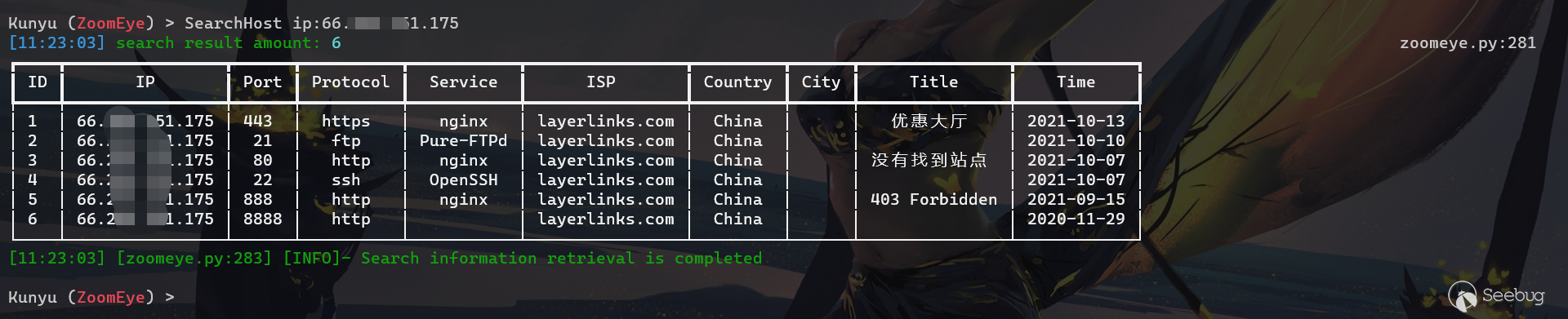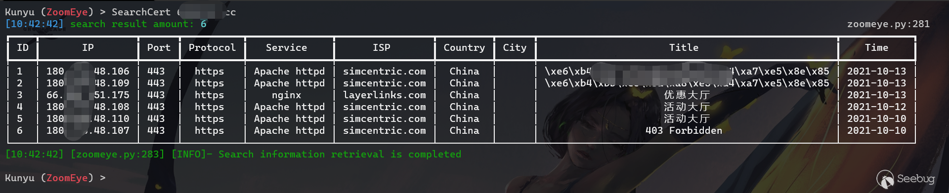 這里,我們使用 Kunyu(坤輿) 利用目標證書序列號作為行為特征關聯匹配,可以看到匹配到6條IP結果,得知該6臺服務器均使用了HTTPS協議,使用了Apache以及Nginx中間件,服務器廠商使用了 simcentric 的服務器(新天域互聯(Simcentric),是香港知名的大型互聯網基礎服務商和idc服務商),網站Title標題,以及更新時間(更新時間有助于快速確認目標服務最近的有效存活時間)。