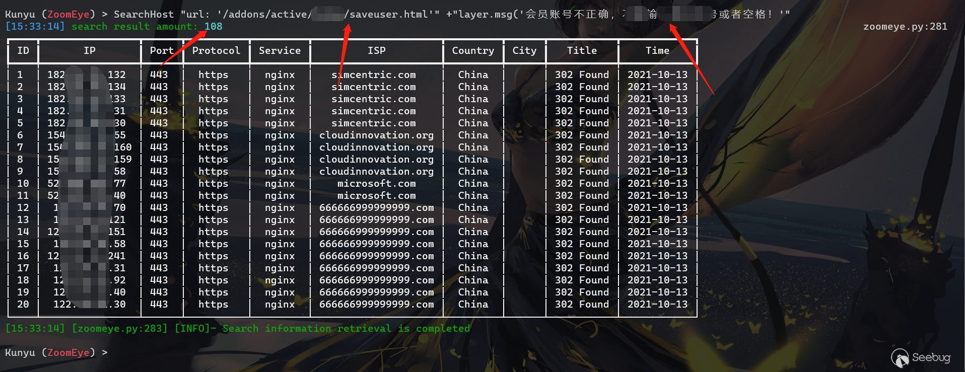當然也支持多因素查找,這里截取了兩段前端代碼,發現匹配結果為108條,多條件匹配下的精準度會更高!這里不僅可以是前端代碼之間組合,也可以使用banner信息,端口信息,ISP等信息組合,根據大家對該組織特征的認知編寫指紋即可,都可以有效的關聯起涉案站點。總之,對于數據的認知很重要。