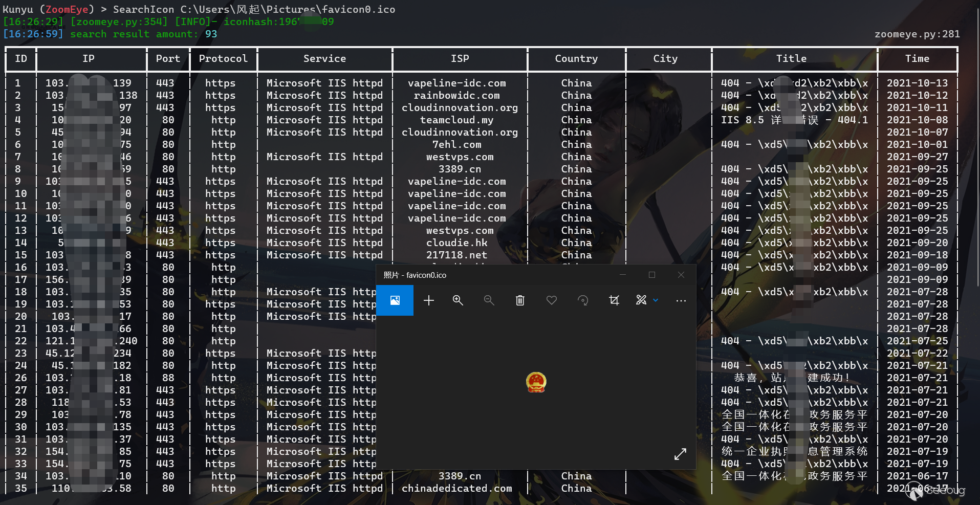 除了上面所述的方式關聯,也可以通過網站上的favicon圖標來作關聯,這里以一個偽造政府網站的案例列舉,他使用了國徽樣式的圖標作為網站favicon圖標,但是因為該圖標經過它們的修改,所以具有了唯一性,可以通過favicon圖標精準的關聯起全網所有使用該偽造圖標的站點,共93條結果。