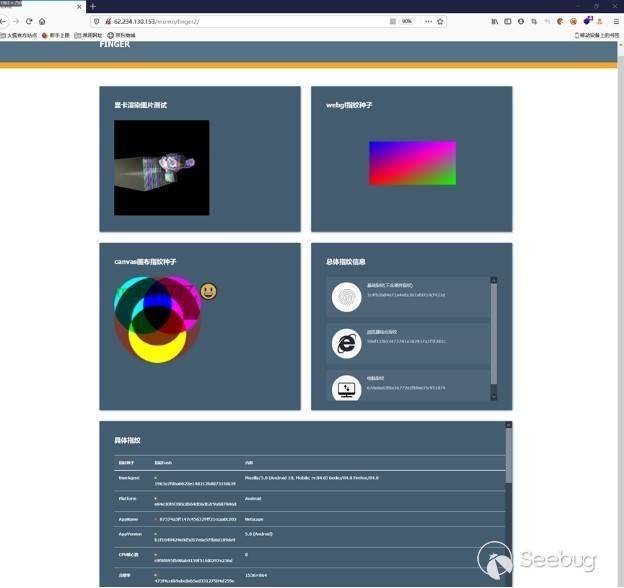 回顯給用戶的結果給如上,具體布局分為WebGl 3D圖像部分、Canvas圖像部分、GPU渲染部分、基礎指紋部分、綜合指紋部分。用戶可對數據進行各個部分的分析處理。