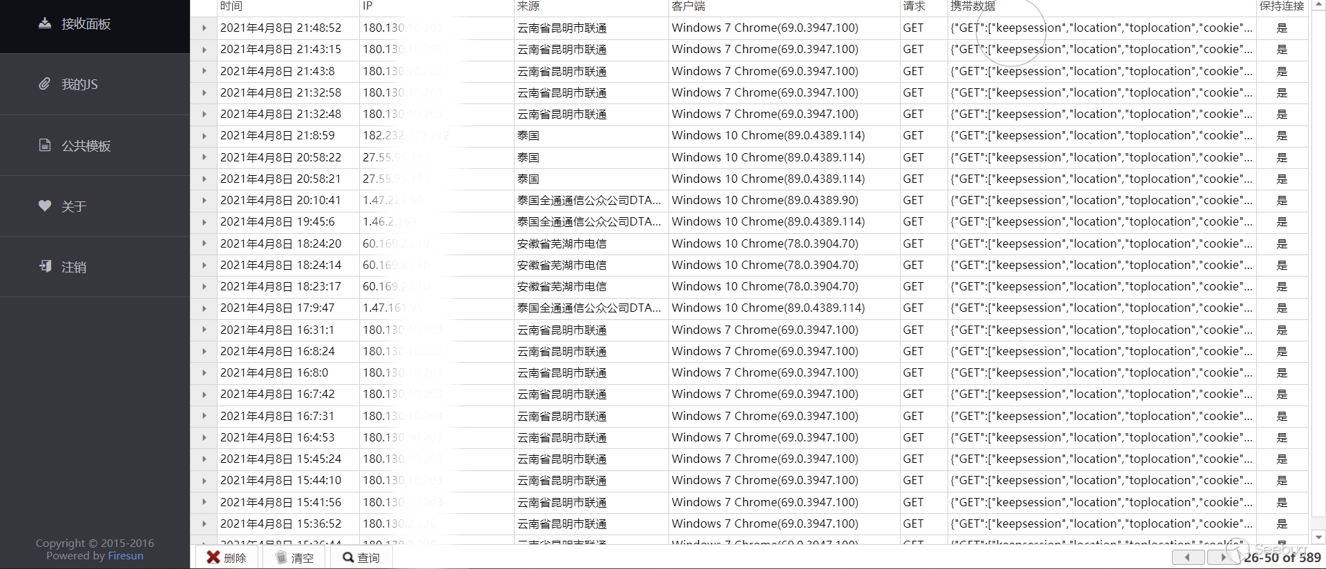 這種以XSS獲取登錄信息的方式無疑是最簡單部署、高效的方式了,但是大家一定發現了。這種方法有著很致命的缺點就是得到的IP地址、設備信息,有著數量多、雜亂、不穩定的特點。試想一下,瀏覽器指紋信息,如果一臺設備他在多個地方使用,且瀏覽器是交替使用的。那么我們就無可考證是否是同一臺設備,僅能判斷出移動設備的型號,而多數團伙的移動設備都是同一購買相同型號的老式手機,也具有一定的躲避追查的效果。至于電腦端的使用就無可考證了,僅能判斷出操作系統信息。所以下面我們引入 高級指紋 的概念。