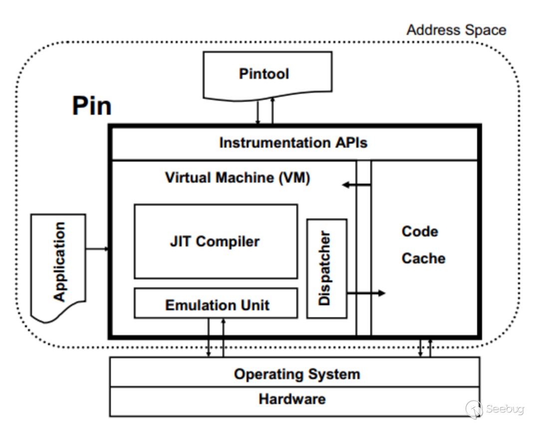 Pin工作在操作系統之上,所以只能捕獲用戶級別的指令。在一個經過插樁的程序運行時,同時有3個程序運行:應用程序本身、Pin、Pintool。Pin是對應用程序進行插樁的引擎,Pintool中包含了插樁的指令,可以看作是Pin的一個library。三者共享同一個地址空間,但不共享庫,避免了沖突。