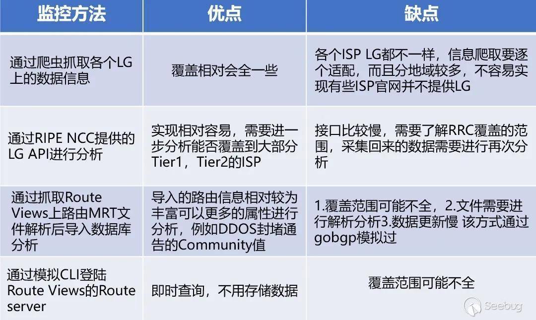 監控方案,涉及到的全球BGP路由更新數據源,可通過多種方式獲取,【圖6】羅列了幾種從外界拉取的方式,這些方案均存在一些缺陷,最明顯的就是實時性和覆蓋率問題。