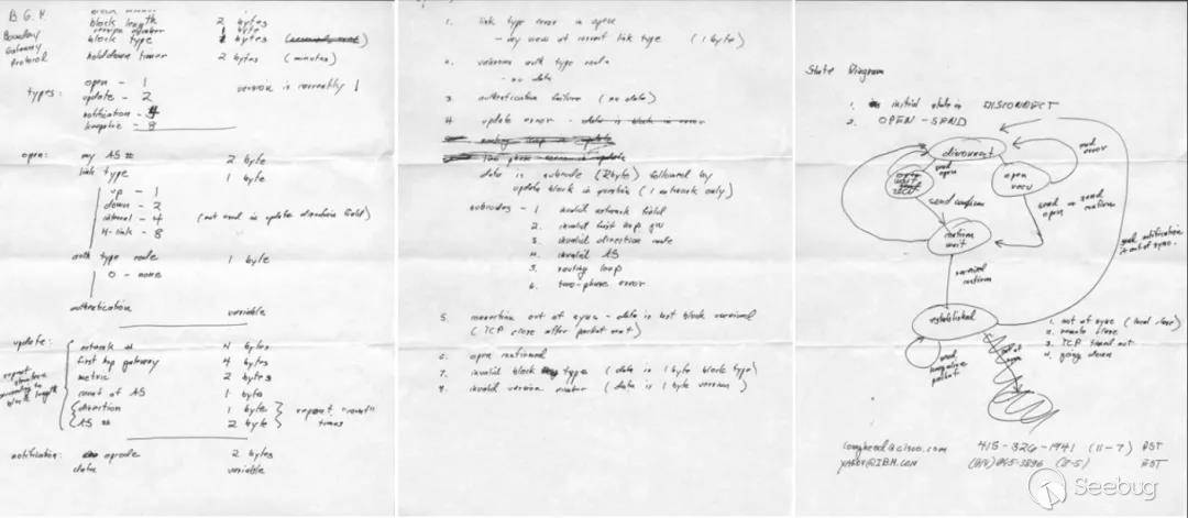 該協議,最初是在1989年1月第12次IETF會議的午餐期間,Yakov Rekhter、 Kurt Lougheed 在 Len Bosak 的幫助下設計的,并寫在了三張餐巾紙上【圖1】。