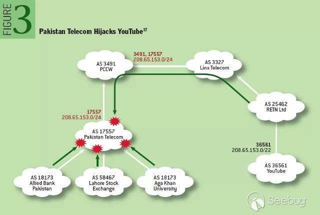 如【圖4】,2008年2月24日,巴基斯坦為了國內言論管制封殺YouTube網站,電信局劫持了國內到YouTube對應IP子前綴208.65.153.0/24的訪問(比YouTube全球宣告的208.65.153.0/22粒度更細),但由于電信局上游運營商PCCW將該劫持路由也通告了到全球,導致YouTube有至少2/3的互聯網流量被劫持到巴基斯坦,致使其全球用戶訪問中斷了2小時。