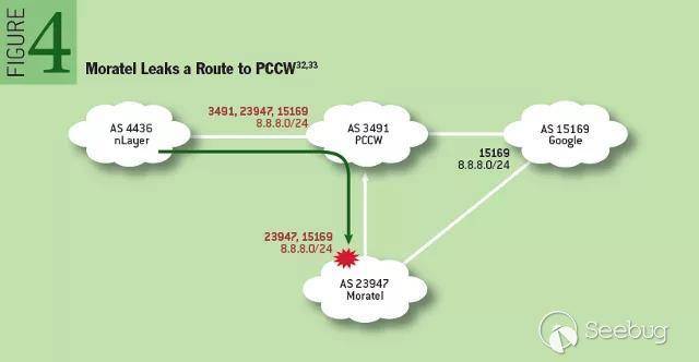 如【圖5】,2012年11月6日,因印尼運營商Moratel在其路由器的錯誤配置,導致Google的8.8.8.0/24的BGP網段路由被泄露到了Moratel上游運營商PCCW,并且被PCCW擴散了錯誤的BGP路由(由于PCCW的本地路由策略)到其網內和互聯AS,結果導致大量訪問Google的互聯網流量經過PCCW后先繞行到Moratel以至于無法處理,其中香港是影響重災區,因為PCCW是香港的主要電信服務商。