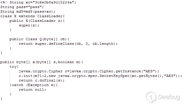 下圖顯示了默認JSP webshell的初始部分以及解密函數。