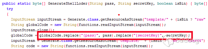 下面,您可以看到代碼在/shells/cryptions/JavaAES/GenerateShellLoder函數下替換了其中一個嵌入式webshell模板中的字符串。