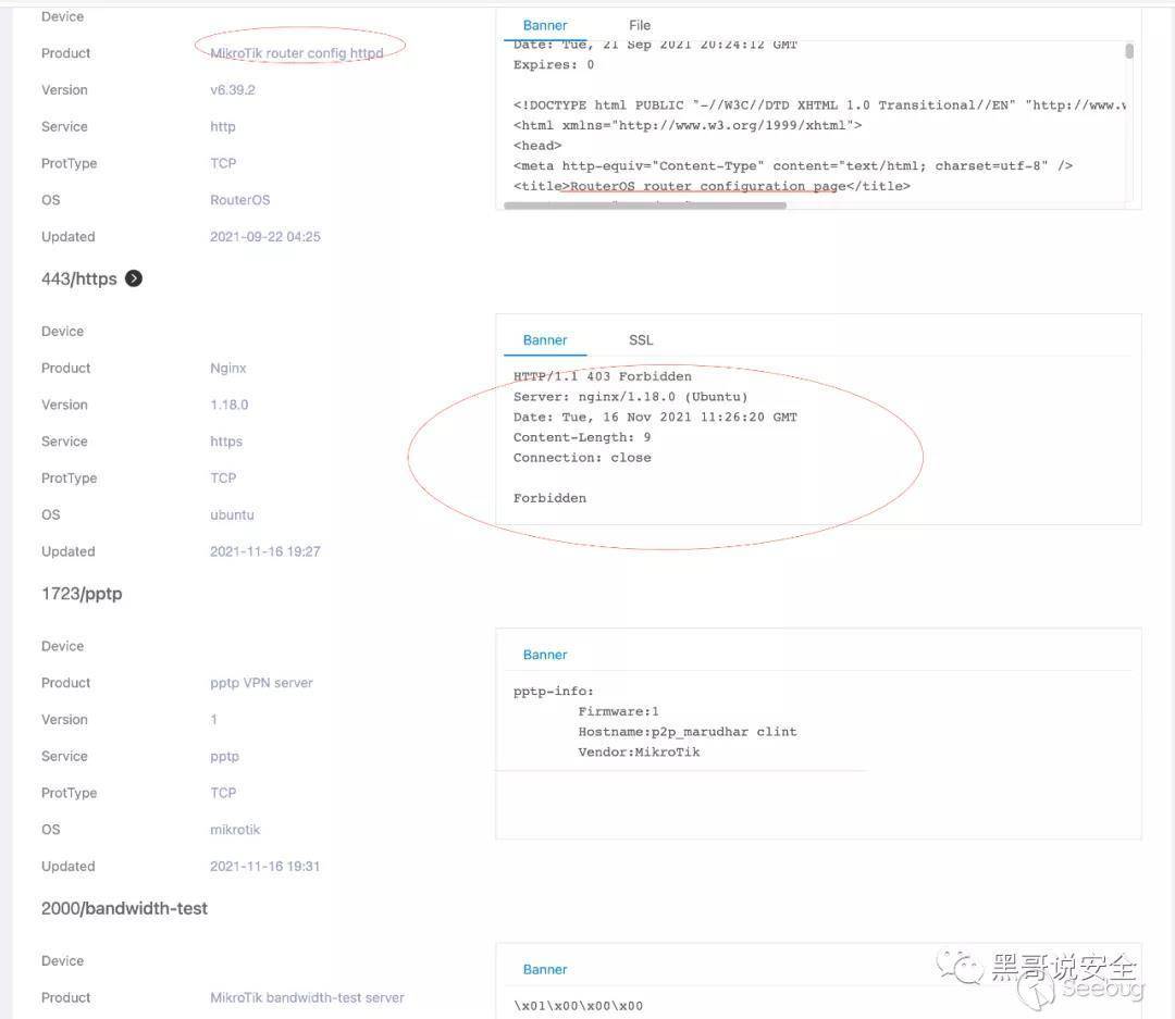 通過ZoomEye查詢到的數據,在前幾頁的目標看了下IP檔案頁面的詳情,發現很多的IP都是MikroTik的設備,而且很多都開了vpn 如下圖: