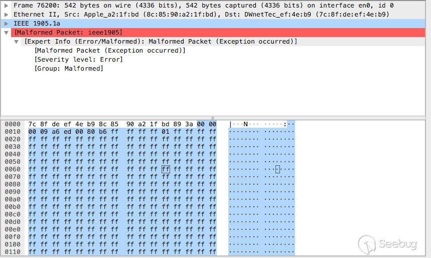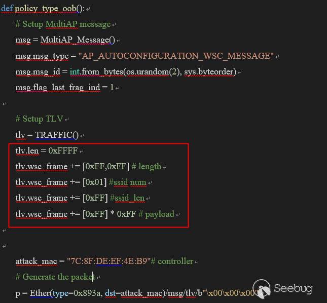 攻擊者可發送畸形的1905包來觸發Controller和Existing Agent中1905 TLV的解析漏洞,圖 9是我們針對“AP_AUTOCONFIGURATION_WSC_MESSAGE”設計的惡意包,可以看到,我們在SSID的len部分填入了0xFF,而實際的SSID最長為64,并在SSID的payload部分中全部填入0xFF,從圖 10實際獲取的數據包中可以看到,實際的SSID部分充滿了我們填充的0xFF的Payload,這是不符合SSID解析的預期。