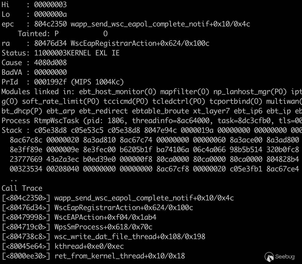 我們使用以上的定制化的Fuzzing工具,便可模擬整個1905 PBC過程,并對M1、M3、M5、M7階段注入Fuzzing Payload,圖 15是我們在Fuzzing過程中,捕獲到的的M7階段的TLV解析導致的越界寫入漏洞的崩潰日志,圖 16是我們捕獲的實際的數據包。