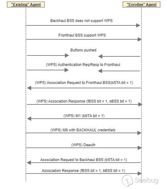 其次Enrollee設備通過1905 PBC來與Fronthaul SSID交互,經過M1-M8的過程后,最終Existing Agent將Backhual的SSID和password返回給Enrollee設備,之后Enrollee設備便能夠連接Backhaul SSID,加入Mesh網絡。