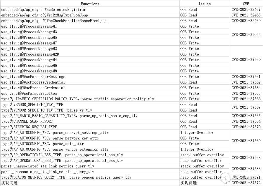 我們使用MeshFuzzer在Mediatek MT7915的EasyMesh解決方案中發現了多處TLV解析導致的內存破壞漏洞,并發現了1處違背安全設計準則的安全問題,累計獲得了19個CVE,問題列表如圖 24所示,目前Mediatek已經修復了所有問題并輸出了安全補丁。
