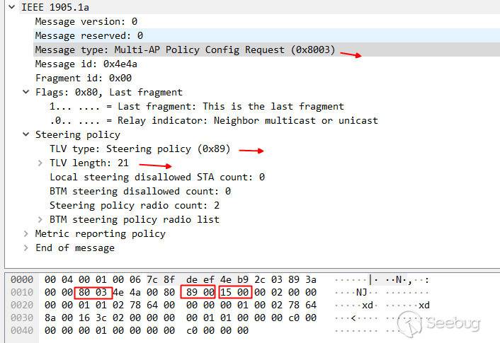 這里選擇“Multi-AP Policy Config Request Message”來作為例子,可以看到圖 6對應的命令字為 0x8003,具體的Streeing Policy則滿足基本的TLV,可以看到圖 6中Type為0x89,len為21,而value則為對應的payload。