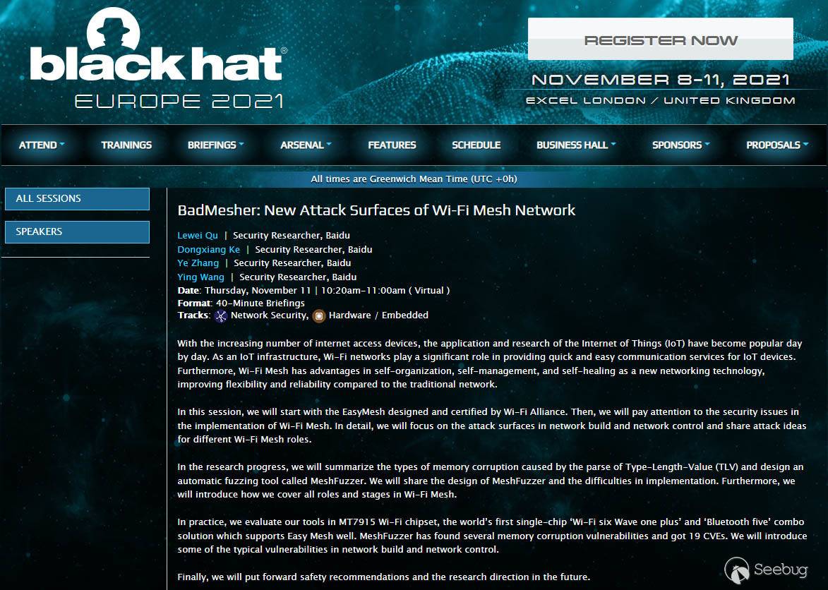 針對WiFi Mesh的新興場景,百度安全的研究員曲樂煒和柯懂湘在北京時間11月11日晚上以線上的形式分享了議題《BadMesher: New Attack Surfaces of Wi-Fi Mesh Network》,該議題主要討論了WiFi Mesh中的安全攻擊面,設計并實現了一套自動化漏洞挖掘工具MeshFuzzer,并展示了其在實際漏洞挖掘過程中的效果。