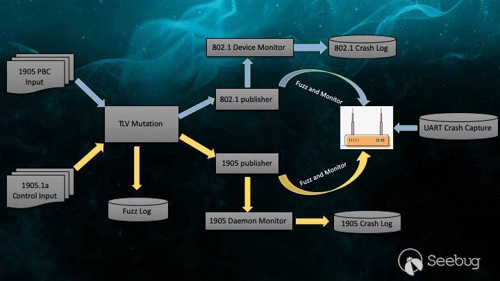 上半部分是我們設計的針對1905 PBC的Fuzzing子系統,我們采用實際設備間的WPS交互數據作為輸入,經過我們的TLV 變異系統,最終使用我們的802.1的發包器來進行發包,與此同時對設備進行串口連接,實時監控crash的狀態。