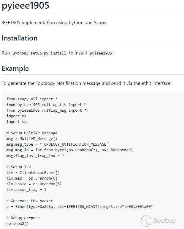 軟件部分:選擇了現有的開源庫pyieee1905,因此我們可以基于pyieee1905來開發自定義的協議字段,這將大大減少我們Fuzzer的開發工作量,我們只需要實現EasyMesh里的控制協議便可對網絡控制部分進行Fuzzing測試。
