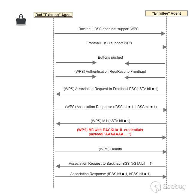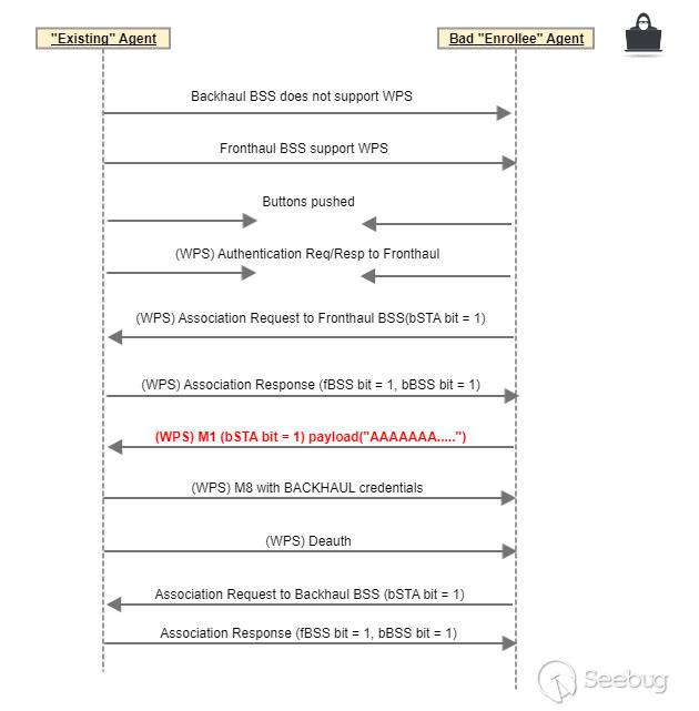 攻擊者構造惡意的Existing Agent設備來攻擊Enrollee設備,具體則是基于1905 PBC回復畸形的M2、M4、M6、M8包來進行攻擊,可觸發Enrollee設備在M2、M4、M6、M8過程中的TLV解析漏洞。