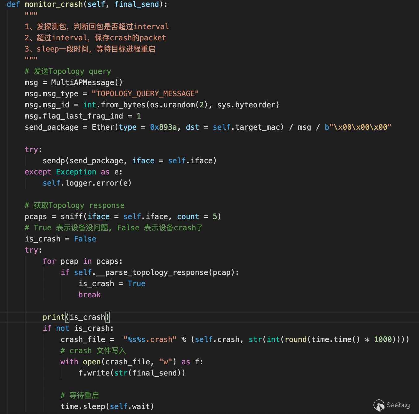 每當我們發出一個Fuzzing Payload,便會發送一次1905 Topology Query,若得到回復,說明1905 Daemon正常工作,若未得到回復,說明1905 Daemon可能出現了問題,此時我們會記錄此次發送的Fuzzing Payload到本地保存,并等待進程的重啟。