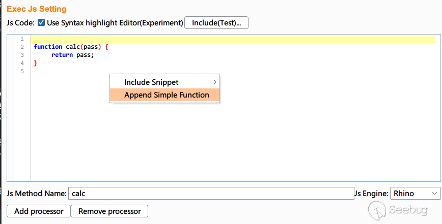使用ExecJS模塊前需要先切換至插件的ExecJS選項卡,像常見編程語言一樣,你需要編寫一個入口函數。不過不同于其他編程語言的入口函數,插件將會把待處理/加密的內容傳遞給入口函數的第一個參數,而你編寫的入口函數則需要在處理結束后返回處理結果。