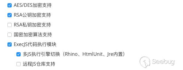 由于軟件開發的復雜性,諸如多層嵌套加密、引入時間變量、動態密鑰、魔改加密算法、新算法的涌現,插件注定永遠無法做到對所有加密算法的百分百覆蓋,所以提供了ExecJS模塊,為動手能力較強的使用者提供一條新途徑。