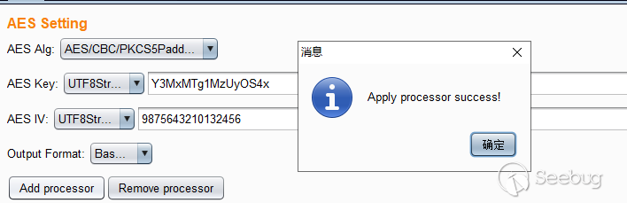 使用方式也較為簡單,首先判斷相關接口的加密算法,填入相應算法的加密密鑰,點擊Add processor,在彈出的加密配置命名輸入對話框中,給予一個易于分辨的名稱,提示Apply processor success!即表示添加成功。