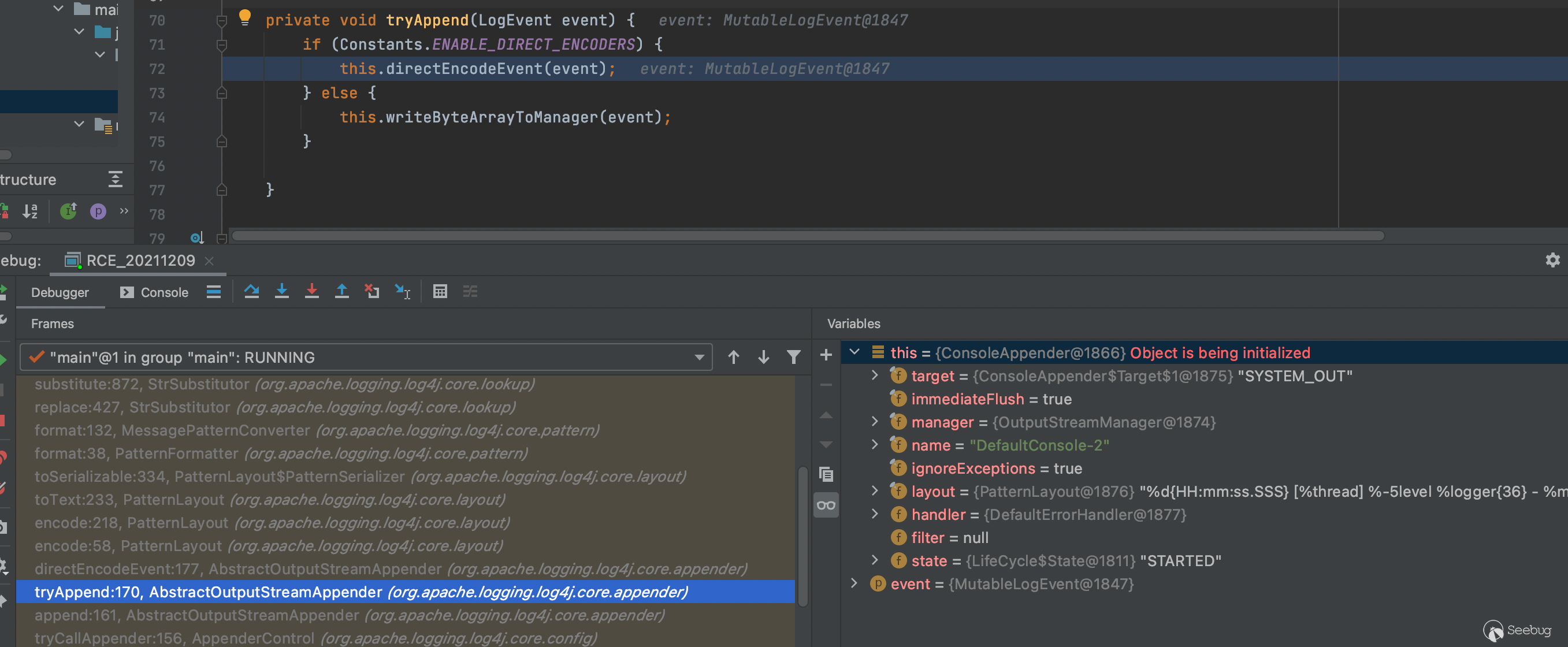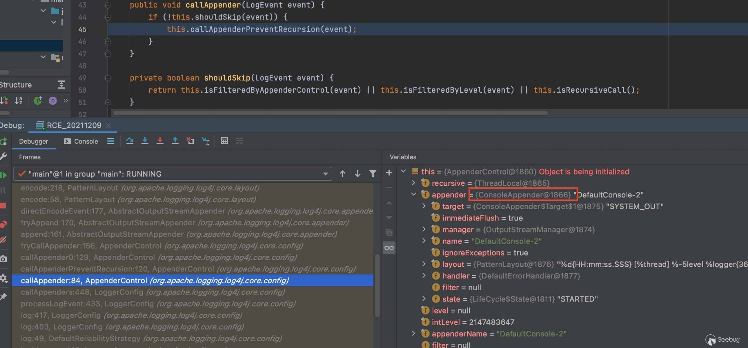 2、Appender功能主要是負責將日志事件傳遞到其目標,常用的Appender有ConsoleAppender(輸出到控制臺)、FileAppender(輸出到本地文件)等,通過AppenderControl獲取具體的Appender,本次調試的是ConsoleAppender。