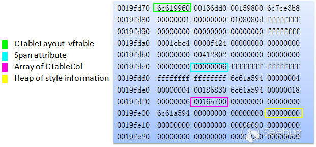好的,我們來看下通過js腳本動態更新span屬性值后,也就是span值變為666時程序第二次在CTableLayout::CalculateMinMax函數入口斷下后是個什么情形,理論上是要重新分配堆空間的,畢竟要多寫入660個樣式信息,而后再獲取此時的span值作為循環控制次數,最后才向堆空間寫入樣式信息。我們來到程序此時斷下來的地方,順便看下之前確實是寫入了6個樣式信息: