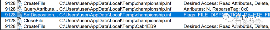 為了方便,我們可以先用makecab打包一個xxxchampionship.inf,然后再用二進制編輯軟件將文件名的前3個字節其修改為../,再次嘗試果然也成功釋放到了Temp目錄下,但是似乎一直沒有被執行,通過仔細查看Process Monitor中的結果,我們發現了下面的一項: