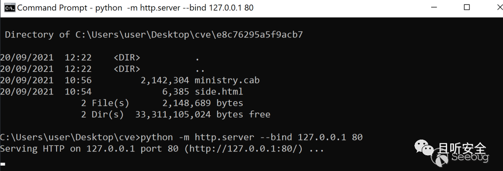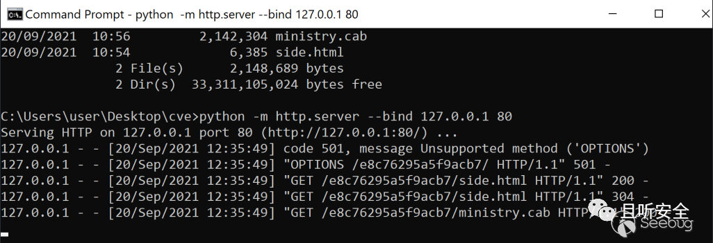 將ministry.cab和side.html預先存放在一個目錄下(目錄名根據前期的樣本分析,設置為e8c76295a5f9acb7),并在上層目錄用python開一個http服務,服務端口為80: