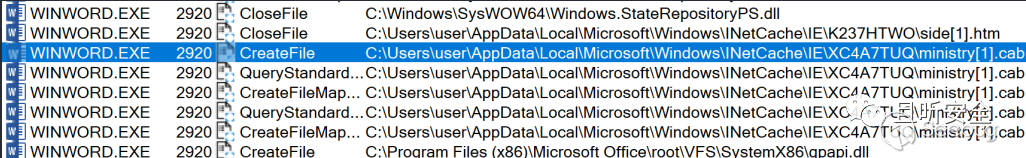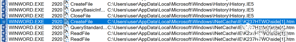 重新打開docx,Process Monitor會記錄word(即winword.exe)的所有操作,可以看到word將side.html存放在臨時目錄下,并改名為side[1].htm