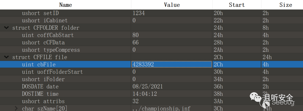 這個問題困擾了我一段時間,但是目前我還不想逆向整個漏洞的成因和觸發流程。現在整個漏洞利用鏈條,我們修改過的僅僅是這個cab文件,所以問題肯定就在這個文件上面,而cab文件的頭又非常簡單,通過幾次嘗試,終于找到了問題所在:就是CFFILE結構中的cbFile字段: