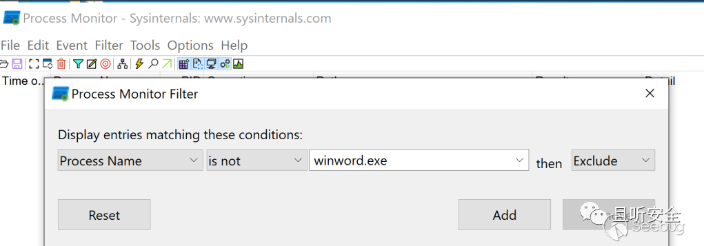可以使用Process Monitor來看一下word在打開惡意樣本的時候到底做了什么,啟動前先設個過濾器: