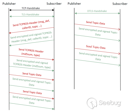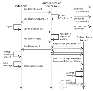 【方案 1】應用層方案,使用外部 Authentication Server 實現 publisher-subscriber 之間的身份認證與加密通信。優點是無需改動 ROS,缺點是應用層實現,無法阻止類似 DoS 攻擊。