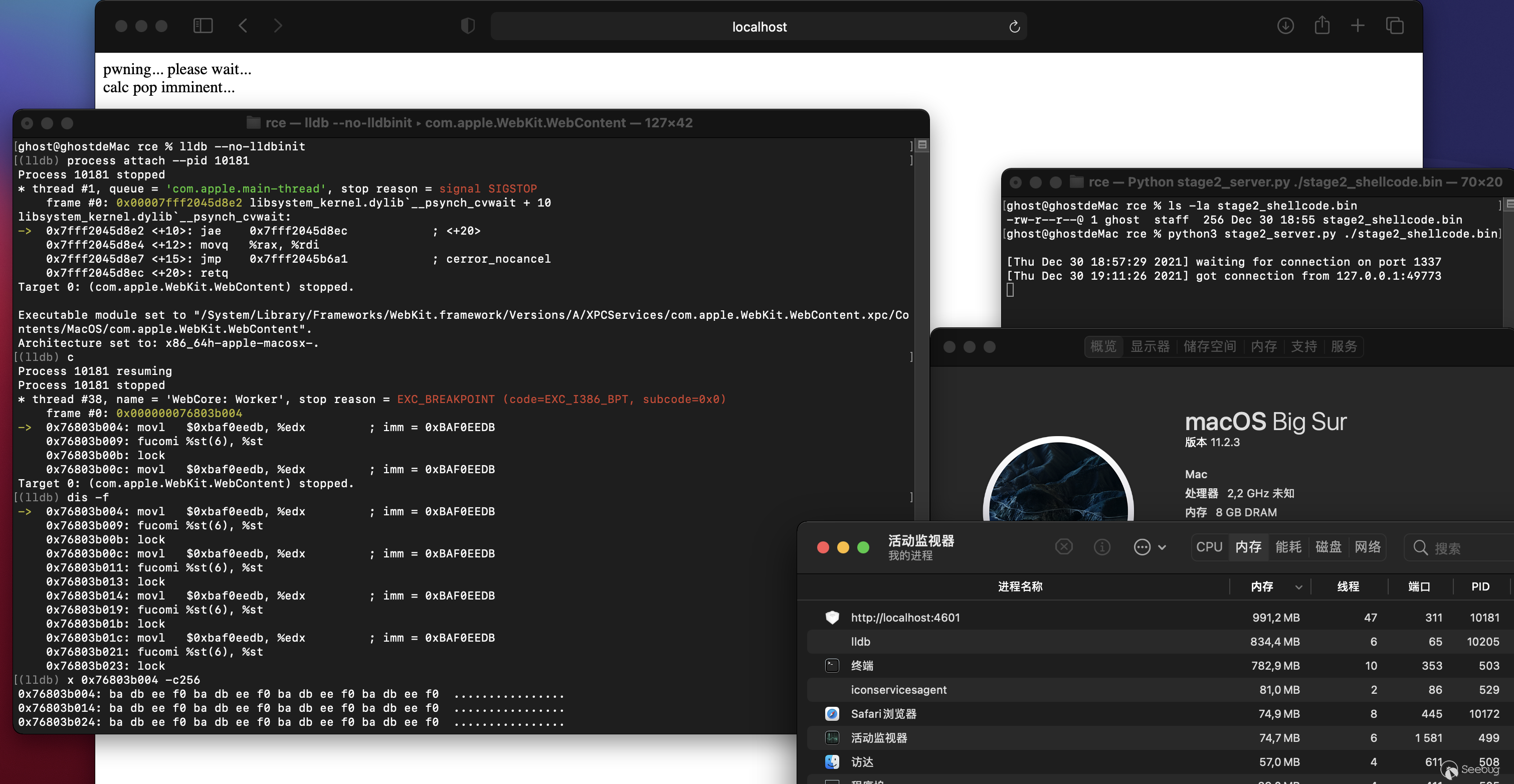 - 由于safari沙箱機制, 僅僅這一個代碼執行的漏洞還沒有突破沙箱的限制, 所以目前單獨復現該漏洞的效果就是能確認第一階段shellcode運行成功, 向目標端口建立socket連接以獲取第二階段shellcode并返回調用