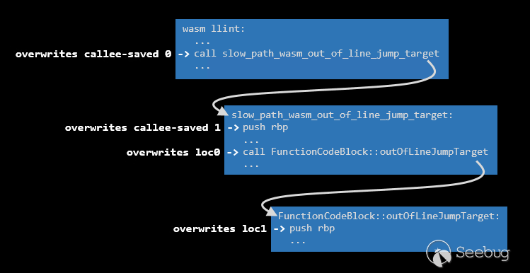 Wasm模塊 -> parse階段(m_maxStackSize = 0xffffffff) -> 函數序言階段(m_numCalleeLocals = 0; 不分配棧空間) -> 運行函數體, 入棧操作覆蓋內存 -> 地址泄露 -> ROP鏈 -> shellcode