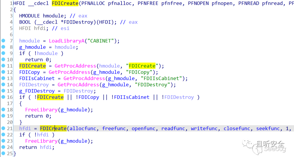 其中FDIDestroy和FDICopy函數則直接調用cabinet中的FDIDestroy和FDICopy,而FDICreate函數會動態加載cabinet.dll,并調用cabinet中的FDICreate函數來創建一個FDI對象: